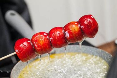 第六步:快速用串好的山楂串在鍋里均勻的裹上糖漿,放到油紙上晾干即可,晾個5-6分鐘大概就可以了~